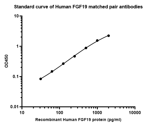 Elisa assay was performed by coating wells of a 96-well plate with 100 µl per well of capture antibody (HA725100) diluted in carbonate/bicarbonate buffer, at a concentration of 2ug/ml overnight at 4℃. Wells of the plate were washed, blocked with 150 µl 0.05% tween-20 1%BSA blocking buffer, and incubated with serial diluted Recombinant Human FGF-19 protein (HA210981) starting from 2,000 pg/ml to 0 pg/ml and detect antibody (HA725101, Biotin, 0.2 µg/ml) for 1 hour at 30℃ with shaking. Then the plate was washed and incubated with 100 µl per well of SA-HRP for 0.5 hour at 30℃ with shaking. Detection was performed using an Ultra TMB Substrate for 10 minutes at room temperature in the dark. The reaction was stopped with sulfuric acid and absorbances were read on a spectrophotometer at 450 nm.