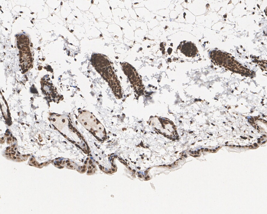 Immunohistochemical analysis of paraffin-embedded mouse skin tissue with Rabbit anti-Phospho-Histone H2A.X (S139) antibody (HA750034) at 1/500 dilution.
