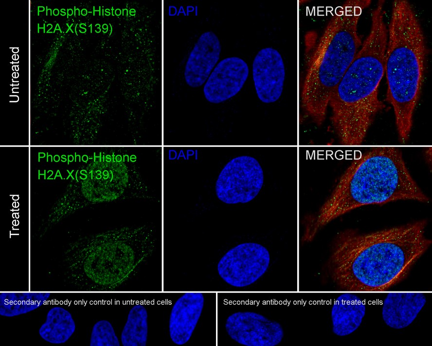 Immunocytochemistry analysis of HeLa cells untreated / treated with 20μM etoposide for 2 hours labeling Phospho-Histone H2A.X (S139) with Rabbit anti-Phospho-Histone H2A.X (S139) antibody (HA750034) at 1/2,000 dilution.