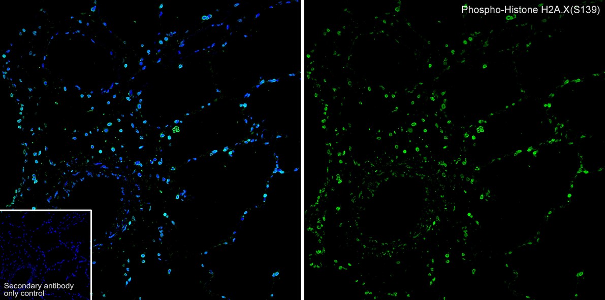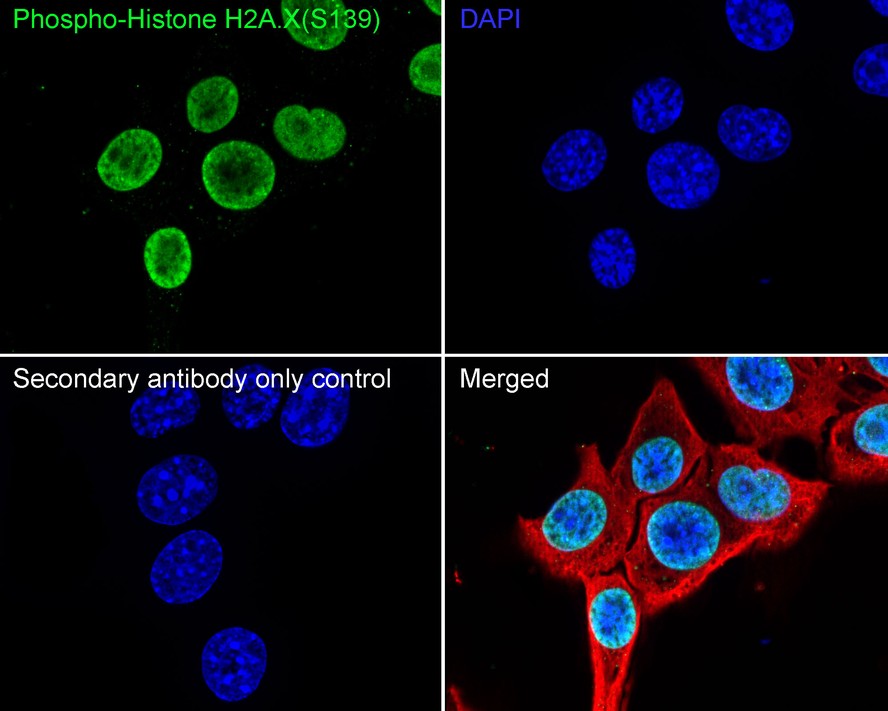 Cells were fixed in 4% paraformaldehyde for 15 minutes at room temperature, permeabilized with 0.1% Triton X-100 in PBS for 15 minutes at room temperature, then blocked with 1% BSA in 10% negative goat serum for 1 hour at room temperature. Cells were then incubated with Rabbit anti-Phospho-Histone H2A.X (S139) antibody (HA750034) at 1/3,000 dilution in 1% BSA in PBST overnight at 4 ℃. Goat Anti-Rabbit IgG H&L (iFluor™ 488, HA1121) was used as the secondary antibody at 1/1,000 dilution. PBS instead of the primary antibody was used as the secondary antibody only control. Nuclear DNA was labelled in blue with DAPI.