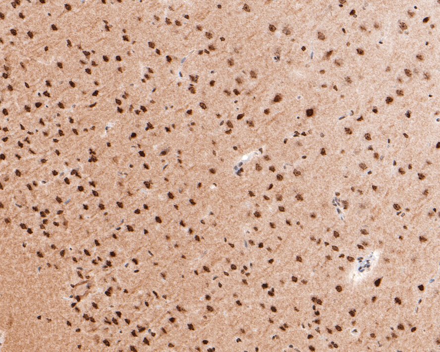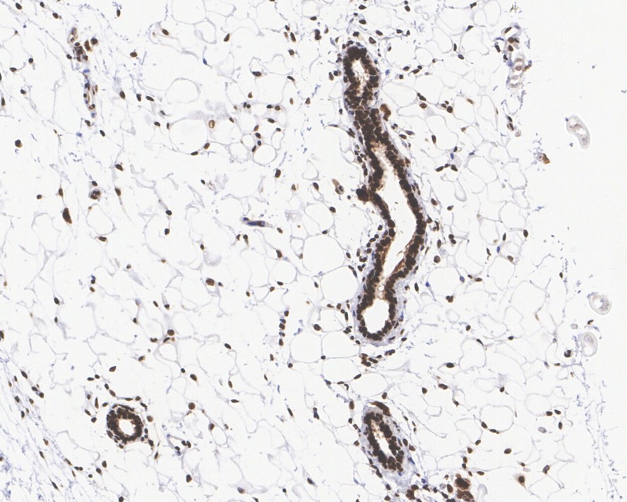 The section was pre-treated using heat mediated antigen retrieval with sodium citrate buffer (pH 6.0) (high pressure) for 2 minutes. The tissues were blocked in 1% BSA for 20 minutes at room temperature, washed with ddH2O and PBS, and then probed with the primary antibody (HA750034) at 1/5,000 dilution for 1 hour at room temperature. The detection was performed using an HRP conjugated compact polymer system. DAB was used as the chromogen. Tissues were counterstained with hematoxylin and mounted with DPX.