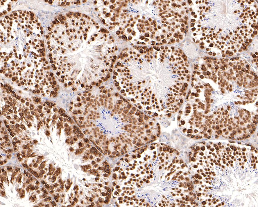 Immunohistochemical analysis of paraffin-embedded mouse testis tissue with Rabbit anti-Phospho-Histone H2A.X (S139) antibody (HA750034) at 1/500 dilution.