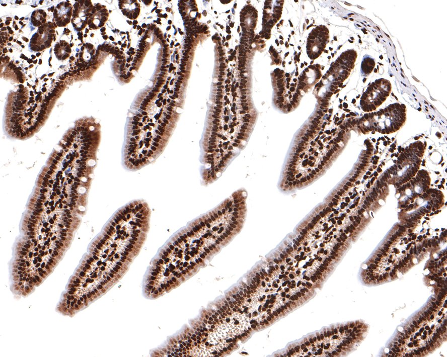 Immunohistochemical analysis of paraffin-embedded mouse small intestine tissue with Rabbit anti-Phospho-Histone H2A.X (S139) antibody (HA750034) at 1/500 dilution.