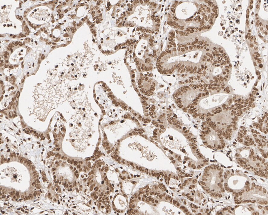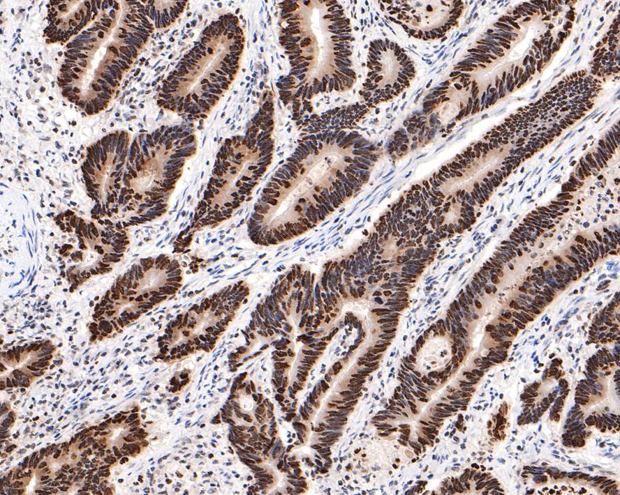 Immunohistochemical analysis of paraffin-embedded human colon carcinoma tissue with Rabbit anti-Phospho-Histone H2A.X (S139) antibody (HA750034) at 1/500 dilution.