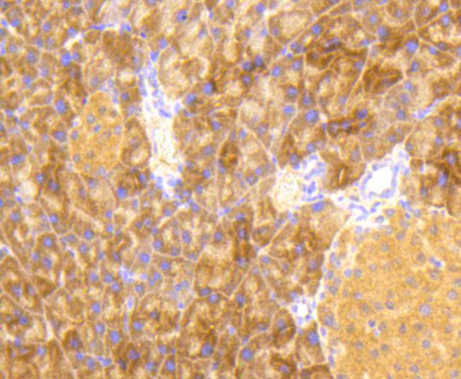 Immunohistochemical analysis of paraffin-embedded mouse pancreas tissue using anti-Phospho-EIF2S1 (S51) antibody. The section was pre-treated using heat mediated antigen retrieval with Tris-EDTA buffer (pH 8.0-8.4) for 20 minutes.The tissues were blocked in 5% BSA for 30 minutes at room temperature, washed with ddH2O and PBS, and then probed with the primary antibody (HA750059, 1/50) for 30 minutes at room temperature. The detection was performed using an HRP conjugated compact polymer system. DAB was used as the chromogen. Tissues were counterstained with hematoxylin and mounted with DPX.