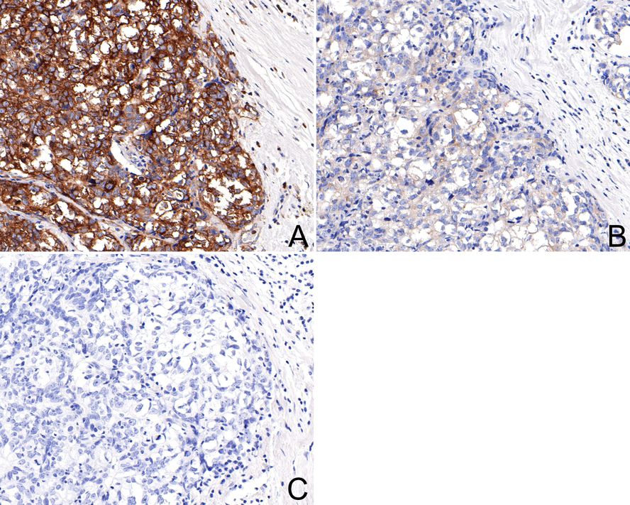 The section was pre-treated using heat mediated antigen retrieval with Tris-EDTA buffer (pH 9.0) for 20 minutes. The tissues were blocked in 1% BSA for 20 minutes at room temperature, washed with ddH2O and PBS, and then probed with the primary antibody (HA750059) at 1/200 dilution for 1 hour at room temperature. The detection was performed using an HRP conjugated compact polymer system. DAB was used as the chromogen. Tissues were counterstained with hematoxylin and mounted with DPX.