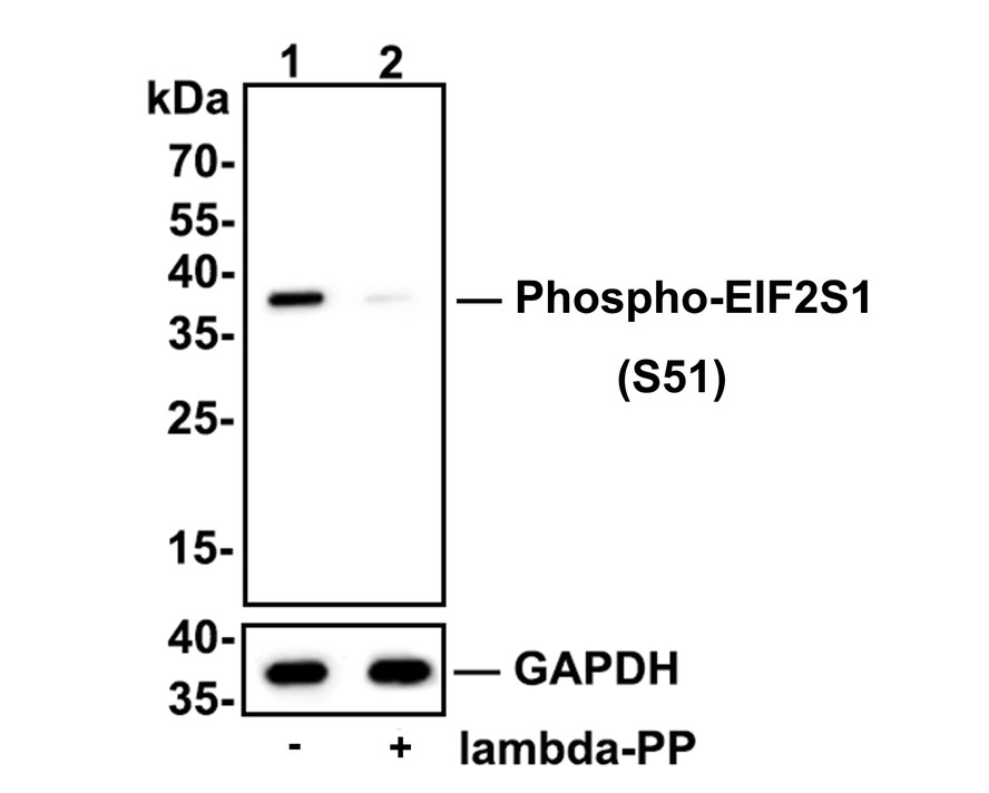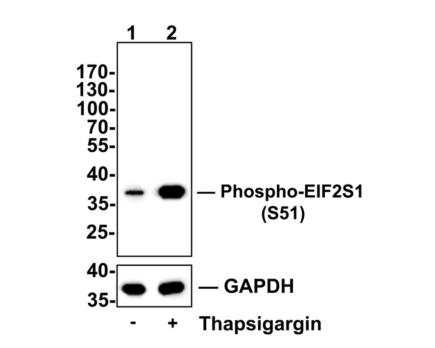 Anti-Phospho-EIF2S1 (S51) antibody (HA750059) at 1/500 dilution. Anti-GAPDH antibody (ET1601-4) at 1/10,000 dilution. Goat Anti-Rabbit IgG H&L (HRP) (HA1001) at 1/200,000 dilution.