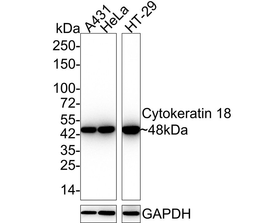 Western blot analysis of Cytokeratin 18 on different lysates with Rabbit anti-Cytokeratin 18 antibody (HA750069) at 1/5,000 dilution.