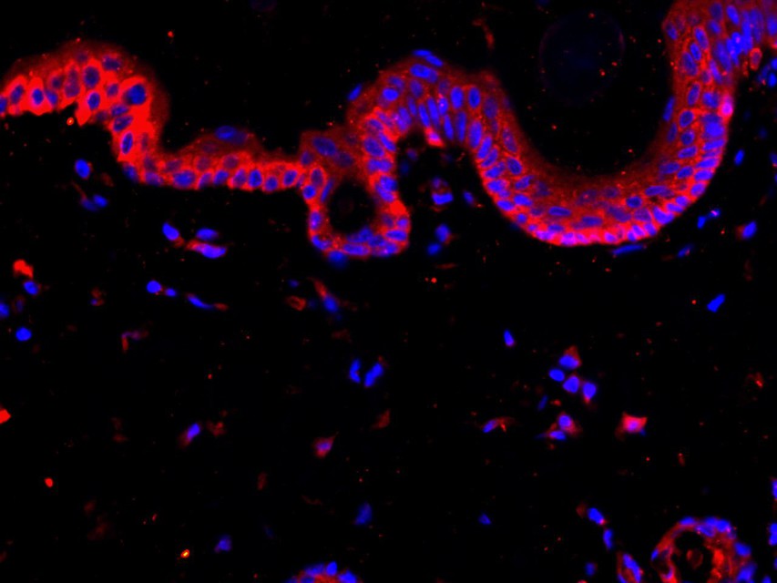 Immunofluorescence analysis of paraffin-embedded rat skin tissue labeling Cytokeratin 18 with Rabbit anti-Cytokeratin 18 antibody (HA750069) at 1/200 dilution.