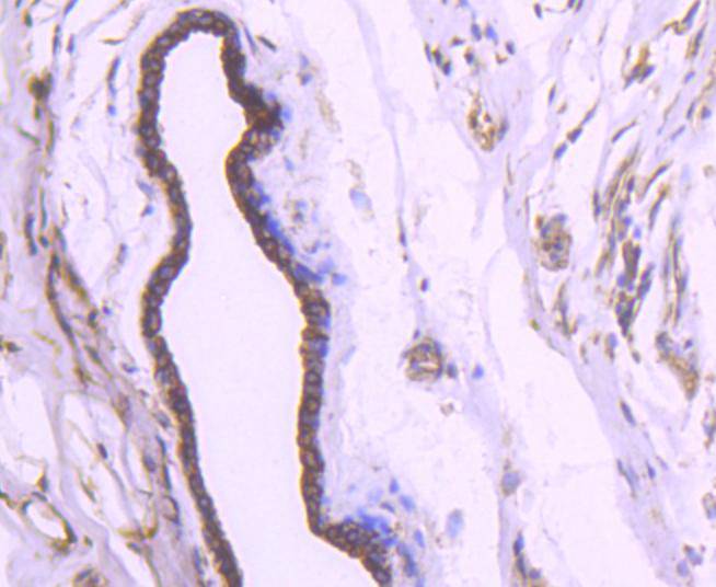 The section was pre-treated using heat mediated antigen retrieval with Tris-EDTA buffer (pH 8.0-8.4) for 20 minutes.The tissues were blocked in 5% BSA for 30 minutes at room temperature, washed with ddH2O and PBS, and then probed with the primary antibody (HA750069, 1/200) for 30 minutes at room temperature. The detection was performed using an HRP conjugated compact polymer system. DAB was used as the chromogen. Tissues were counterstained with hematoxylin and mounted with DPX.