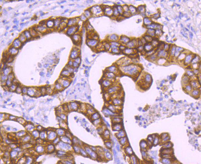 Immunohistochemical analysis of paraffin-embedded human colon carcinoma tissue with Rabbit anti-Cytokeratin 18 antibody (HA750069) at 1/50 dilution.