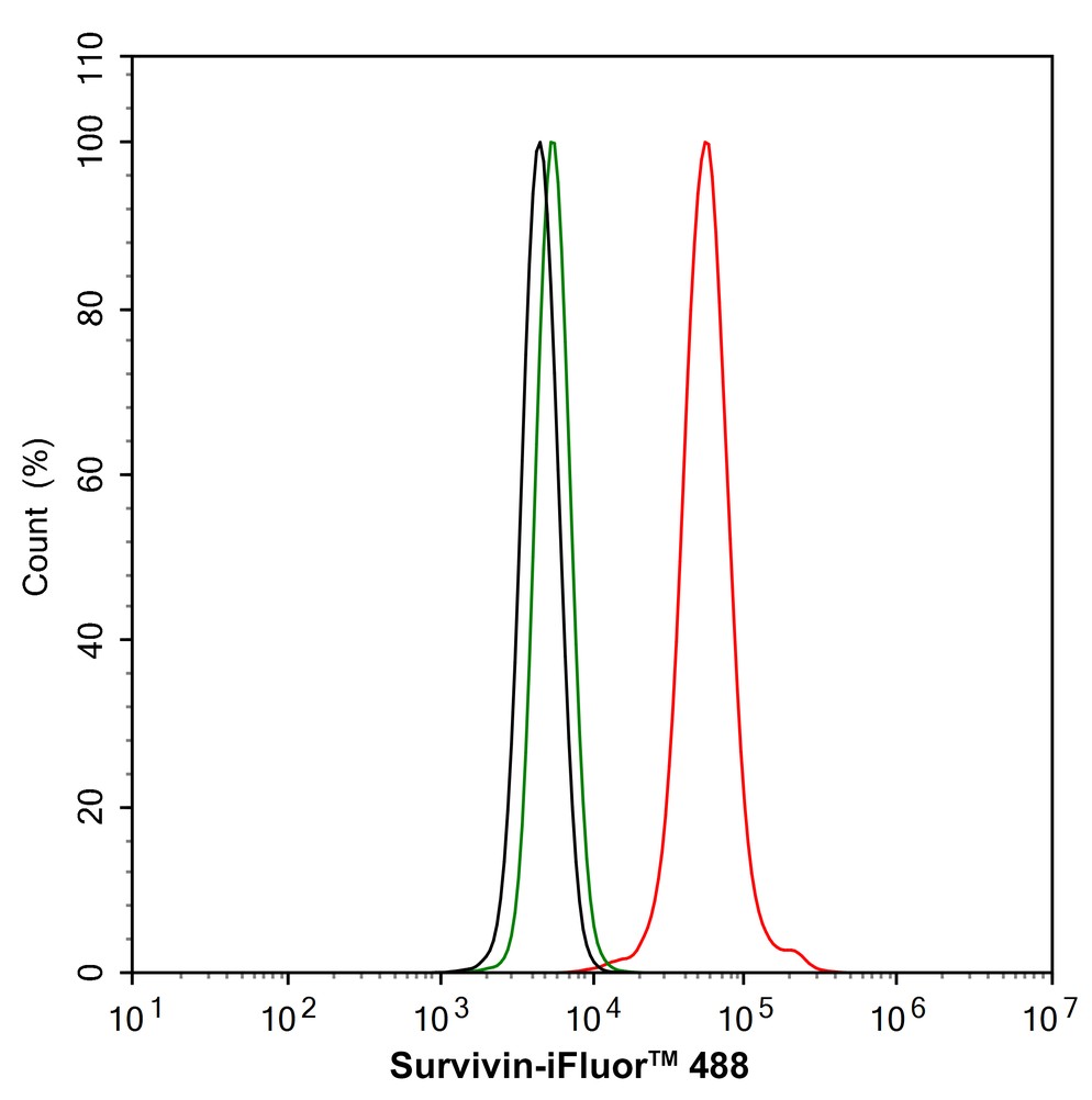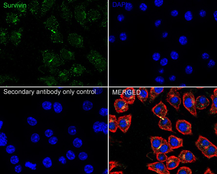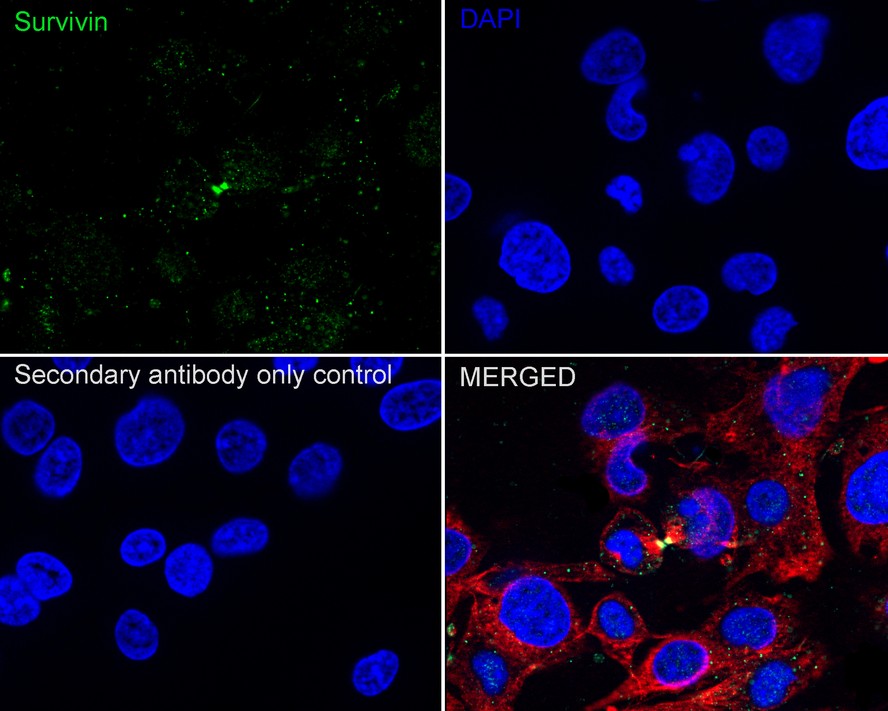 Cells were fixed in 4% paraformaldehyde for 15 minutes at room temperature, permeabilized with 0.1% Triton X-100 in PBS for 15 minutes at room temperature, then blocked with 1% BSA in 10% negative goat serum for 1 hour at room temperature. Cells were then incubated with Rabbit anti-Survivin antibody (HA750076) at 1/100 dilution in 1% BSA in PBST overnight at 4 ℃. Goat Anti-Rabbit IgG H&L (iFluor™ 488, HA1121) was used as the secondary antibody at 1/1,000 dilution. PBS instead of the primary antibody was used as the secondary antibody only control. Nuclear DNA was labelled in blue with DAPI.