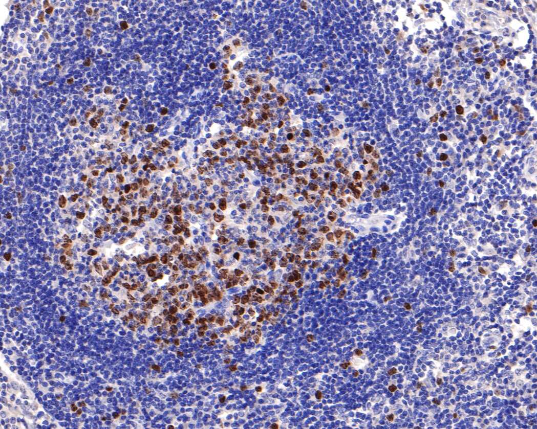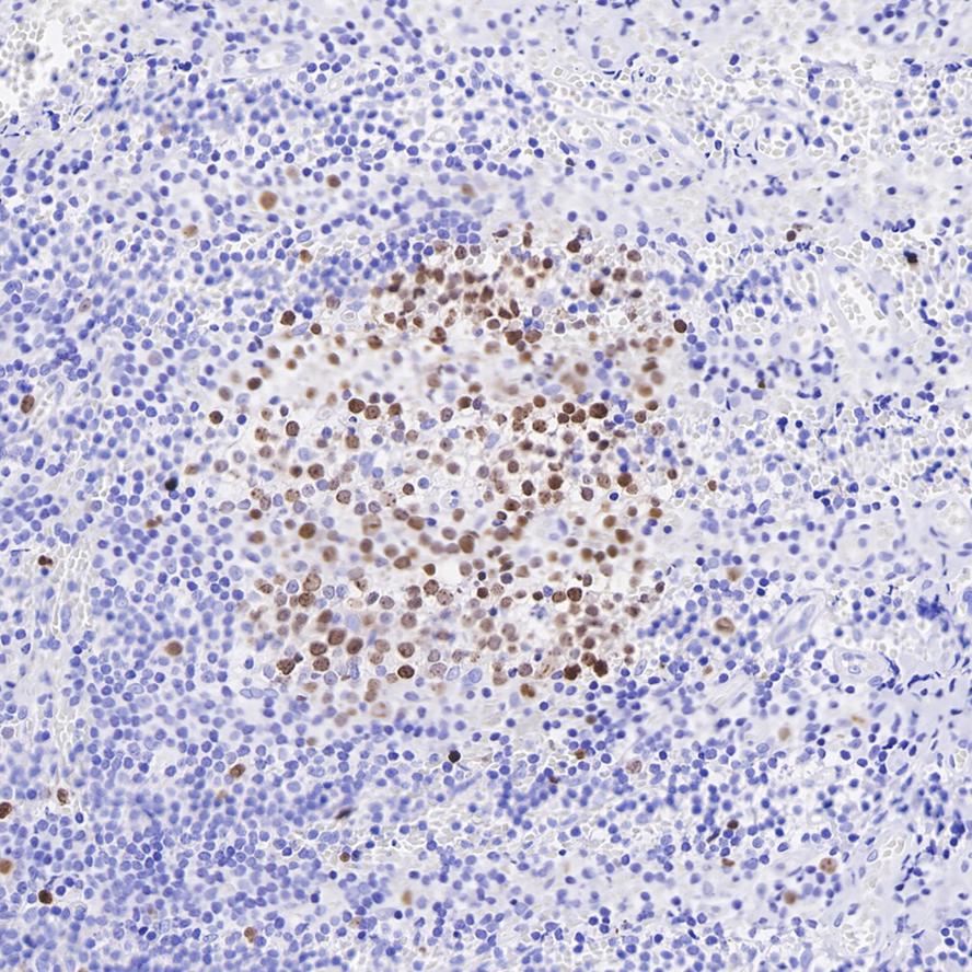 Immunohistochemical analysis of paraffin-embedded human lymph node tissue using anti-Survivin antibody. The section was pre-treated using heat mediated antigen retrieval with sodium citrate buffer (pH 6.0) (high pressure) for 2 minutes. The tissues were blocked in 1% BSA for 30 minutes at room temperature, washed with ddH2O and PBS, and then probed with the primary antibody (HA750076, 1/400) for 30 minutes at room temperature. The detection was performed using an HRP conjugated compact polymer system. DAB was used as the chromogen. Tissues were counterstained with hematoxylin and mounted with DPX.