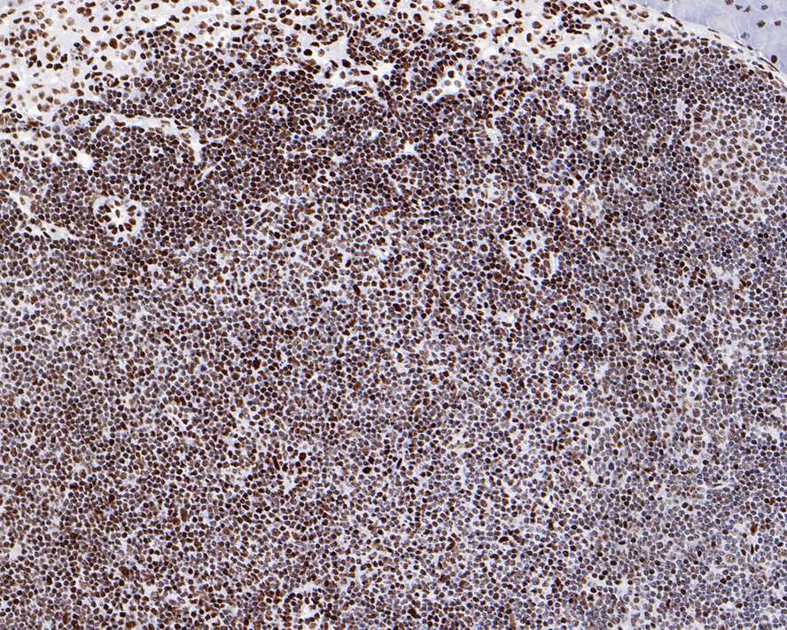 Immunohistochemical analysis of paraffin-embedded mouse lymph nodes tissue with Rabbit anti-HDAC1 antibody (HA750083) at 1/800 dilution.