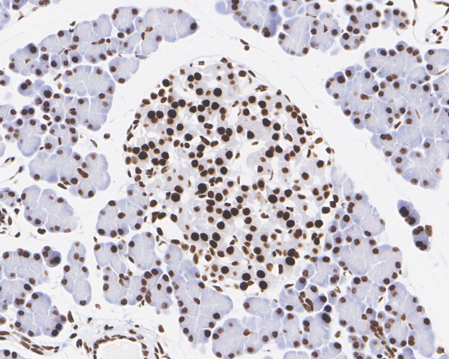 Immunohistochemical analysis of paraffin-embedded mouse pancreas tissue with Rabbit anti-HDAC1 antibody (HA750083) at 1/200 dilution.