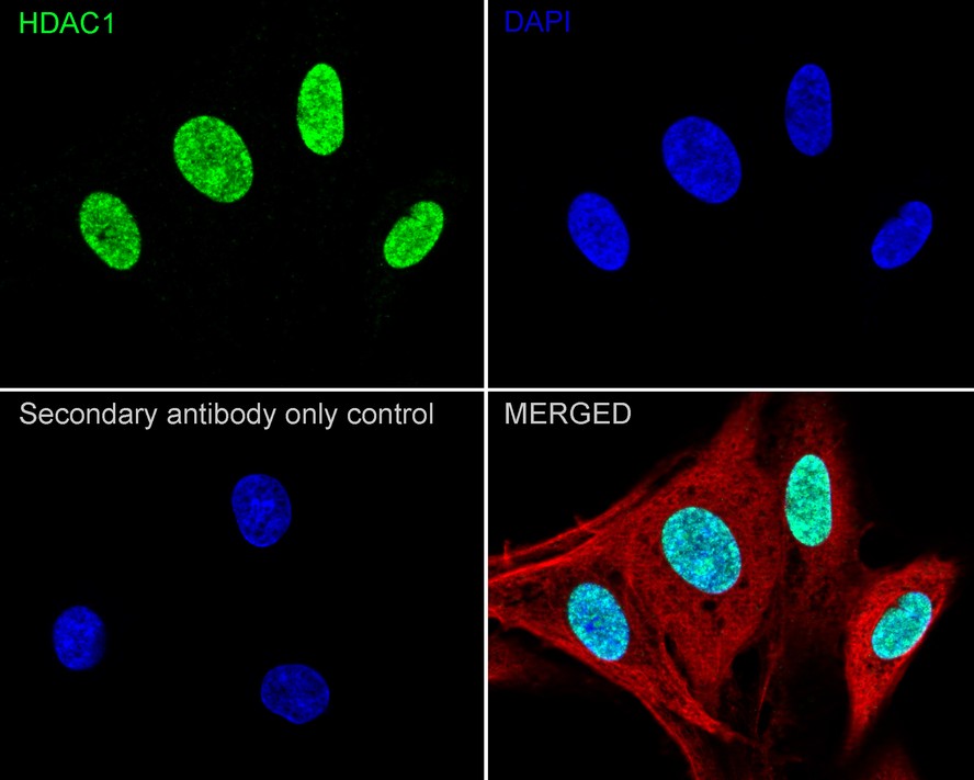 Cells were fixed in 4% paraformaldehyde for 20 minutes at room temperature, permeabilized with 0.1% Triton X-100 in PBS for 5 minutes at room temperature, then blocked with 1% BSA in 10% negative goat serum for 1 hour at room temperature. Cells were then incubated with Rabbit anti-HDAC1 antibody (HA750083) at 1/250 dilution and competitor's antibody at 1/200 dilution in 1% BSA in PBST overnight at 4 ℃. Goat Anti-Rabbit IgG H&L (iFluor™ 488, HA1121) was used as the secondary antibody at 1/1,000 dilution. PBS instead of the primary antibody was used as the secondary antibody only control. Nuclear DNA was labelled in blue with DAPI.