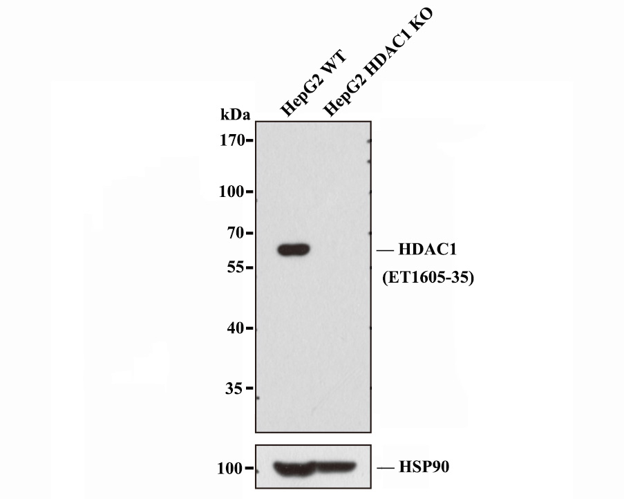 HA750083 was shown to specifically react with HDAC1 in wild-type HepG2 cells. No band was observed when HDAC1 knockout samples were tested. Wild-type and HDAC1 knockout samples were subjected to SDS-PAGE. Proteins were transferred to a PVDF membrane and blocked with 5% NFDM in TBST for 1 hour at room temperature. The primary Anti-HDAC1 antibody (HA750083, 1/1,000) and Anti-HSP90 antibody (ET1605-56, 1/10,000) were used in 5% BSA at room temperature for 2 hours. Goat Anti-Rabbit IgG H&L (HRP) Secondary Antibody (HA1001) at 1:200,000 dilution was used for 1 hour at room temperature.