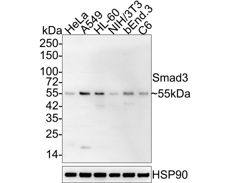 Western blot analysis of Smad3 on different lysates with Rabbit anti-Smad3 antibody (HA750123) at 1/20,000 dilution.