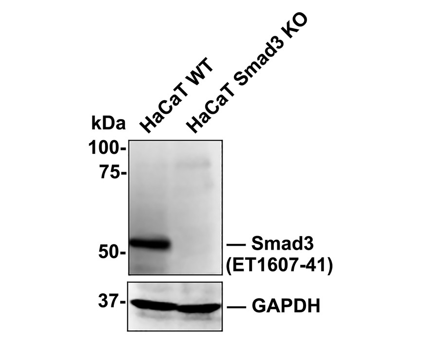 ET1607-41 was shown to specifically react with Smad3 in wild-type HaCaT cells. NO band was observed when Smad3 knockout sample was tested. Wild-type and Smad3 knockout samples were subjected to SDS-PAGE. Proteins were transferred to a PVDF membrane and blocked with 5% NFDM in TBST for 1 hour at room temperature. The primary antibody (ET1607-41, 1:1,000) was used in 5% BSA at room temperature for 2 hours. Goat anti-Rabbit IgG-HRP antibody at 1:10,000 dilution was used for 1 hour at room temperature.