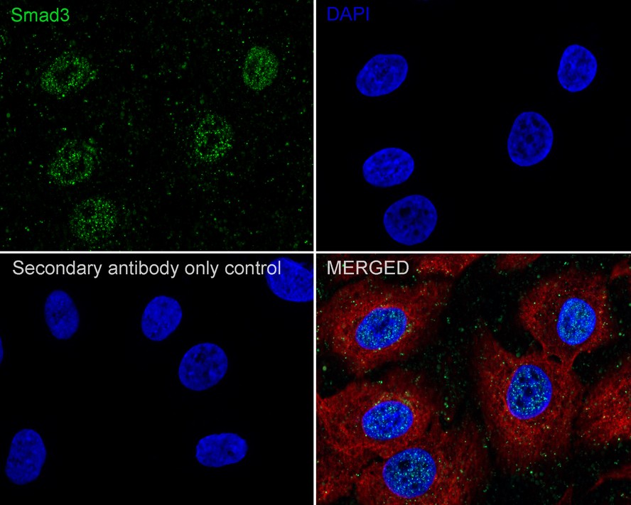Cells were fixed in 4% paraformaldehyde for 20 minutes at room temperature, permeabilized with 0.1% Triton X-100 in PBS for 5 minutes at room temperature, then blocked with 1% BSA in 10% negative goat serum for 1 hour at room temperature. Cells were then incubated with Rabbit anti-Smad3 antibody (HA750123) at 1/500 dilution in 1% BSA in PBST overnight at 4 ℃. Goat Anti-Rabbit IgG H&L (iFluor™ 488, HA1121) was used as the secondary antibody at 1/1,000 dilution. PBS instead of the primary antibody was used as the secondary antibody only control. Nuclear DNA was labelled in blue with DAPI.