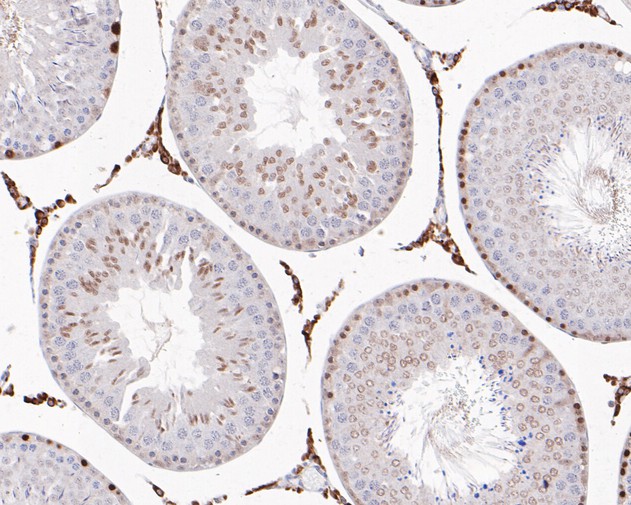 Immunohistochemical analysis of paraffin-embedded rat testis tissue using anti-Smad3 antibody. The section was pre-treated using heat mediated antigen retrieval with sodium citrate buffer (pH 6.0) (high pressure) for 2 minutes. The tissues were blocked in 5% BSA for 30 minutes at room temperature, washed with ddH2O and PBS, and then probed with the primary antibody (HA750123, 1/200) for 30 minutes at room temperature. The detection was performed using an HRP conjugated compact polymer system. DAB was used as the chromogen. Tissues were counterstained with hematoxylin and mounted with DPX.
