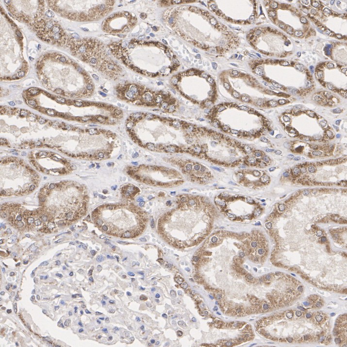The section was pre-treated using heat mediated antigen retrieval with Tris-EDTA buffer (pH 9.0) for 20 minutes. The tissues were blocked in 1% BSA for 20 minutes at room temperature, washed with ddH2O and PBS, and then probed with the primary antibody (HA750123) at 1/1,000 dilution for 1 hour at room temperature. The detection was performed using an HRP conjugated compact polymer system. DAB was used as the chromogen. Tissues were counterstained with hematoxylin and mounted with DPX.