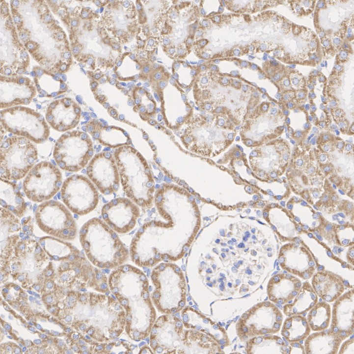 Immunohistochemical analysis of paraffin-embedded mouse kidney tissue with Rabbit anti-TOMM20 antibody (HA750166) at 1/500 dilution.