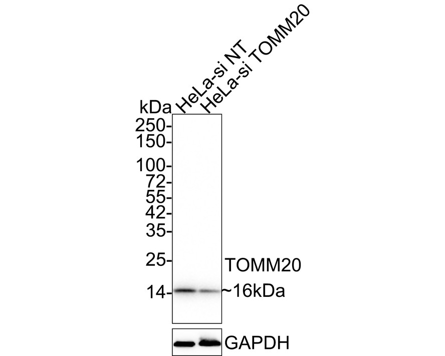 Lane 2: HeLa-si TOMM20 cell lysate (10 µg/Lane)