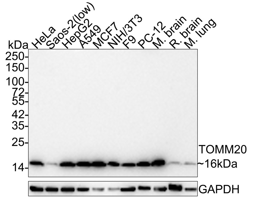 Western blot analysis of TOMM20 on different lysates with Rabbit anti-TOMM20 antibody (HA750166) at 1/5,000 dilution.