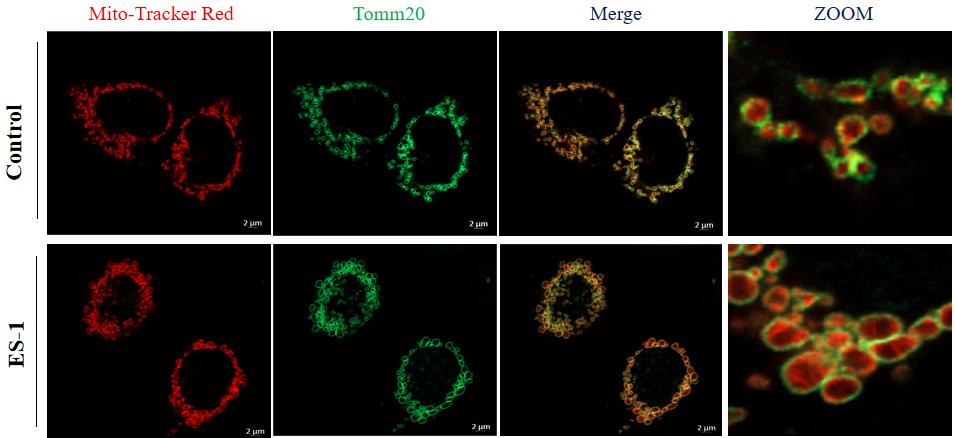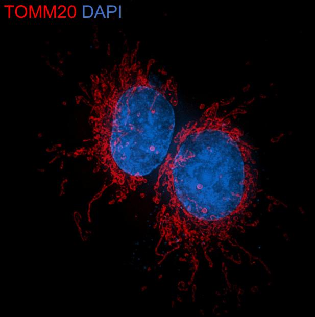 Cells were fixed in 4% paraformaldehyde for 15 minutes at room temperature, permeabilized with 0.1% Triton X-100 in PBS for 15 minutes at room temperature, then blocked with 1% BSA in 10% negative goat serum for 1 hour at room temperature. Cells were then incubated with Rabbit anti-TOMM20 antibody (HA750166) at 1/1,000 dilution in 1% BSA in PBST overnight at 4 ℃. Goat Anti-Rabbit IgG H&L (iFluor™ 488, HA1121) was used as the secondary antibody at 1/1,000 dilution. PBS instead of the primary antibody was used as the secondary antibody only control. Counterstained with Mitotracker. Nuclear DNA was labelled in blue with DAPI.