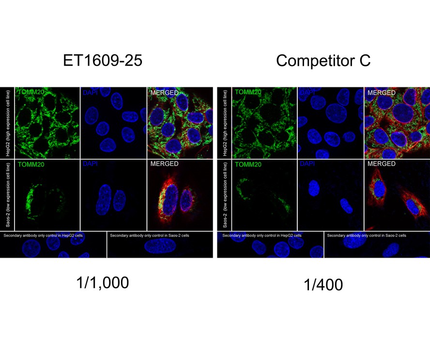Immunocytochemistry analysis of HepG2 (high expression) and Saos-2 (low expression) labeling TOMM20 with Rabbit anti-TOMM20 antibody (HA750166) at 1/1,000 dilution and competitor's antibody at 1/400 dilution.