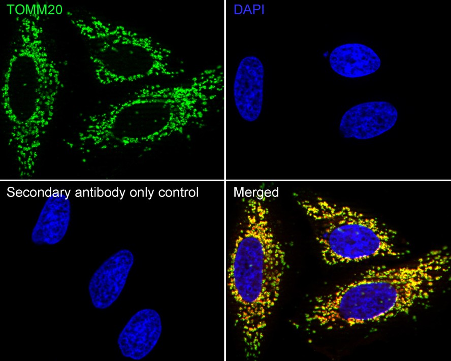 Cells were fixed in 4% paraformaldehyde for 20 minutes at room temperature, permeabilized with 0.1% Triton X-100 in PBS for 5 minutes at room temperature, then blocked with 1% BSA in 10% negative goat serum for 1 hour at room temperature. Cells were then incubated with Rabbit anti-TOMM20 antibody (HA750166) at 1/1,000 dilution and competitor's antibody at 1/400 dilution in 1% BSA in PBST overnight at 4 ℃. Goat Anti-Rabbit IgG H&L (iFluor™ 488, HA1121) was used as the secondary antibody at 1/1,000 dilution. PBS instead of the primary antibody was used as the secondary antibody only control. Nuclear DNA was labelled in blue with DAPI.