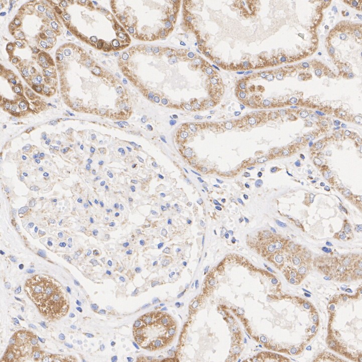Immunohistochemical analysis of paraffin-embedded human kidney tissue with Rabbit anti-TOMM20 antibody (HA750166) at 1/500 dilution.