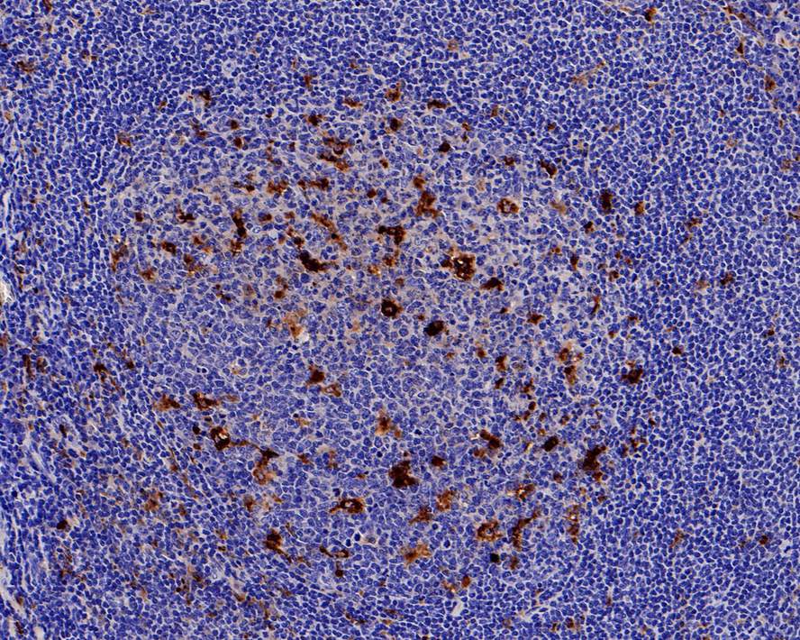 Immunohistochemical analysis of paraffin-embedded mouse spleen tissue with Rabbit anti-Lysozyme antibody (HA750170) at 1/500 dilution.