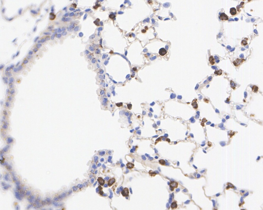 Immunohistochemical analysis of paraffin-embedded mouse lung tissue with Rabbit anti-Lysozyme antibody (HA750170) at 1/500 dilution.