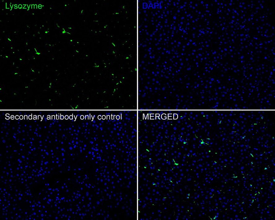 Immunofluorescence analysis of paraffin-embedded human liver tissue labeling Lysozyme with Rabbit anti-Lysozyme antibody (HA750170) at 1/100 dilution.