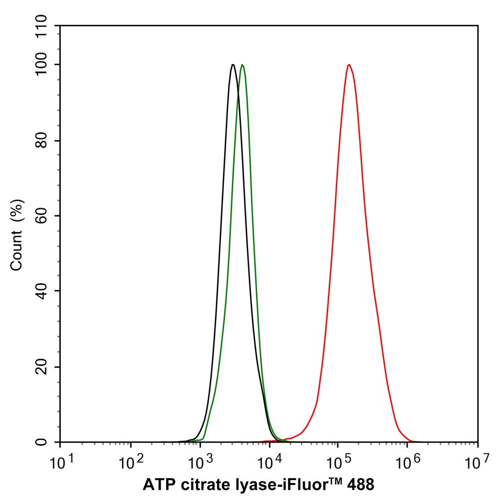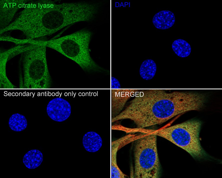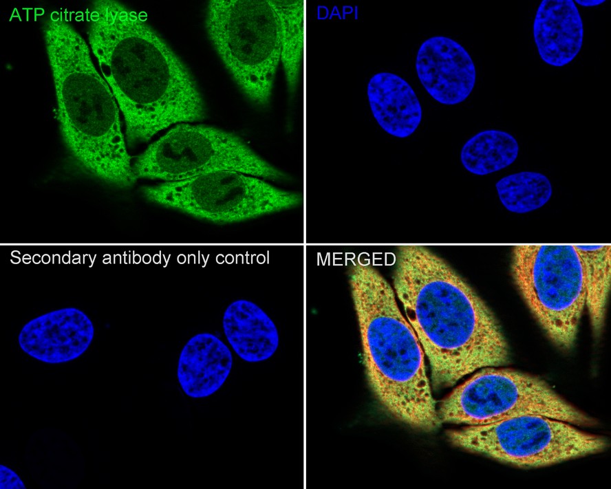 Cells were fixed in 4% paraformaldehyde for 20 minutes at room temperature, permeabilized with 0.1% Triton X-100 in PBS for 5 minutes at room temperature, then blocked with 1% BSA in 10% negative goat serum for 1 hour at room temperature. Cells were then incubated with Rabbit anti-ATP citrate lyase antibody (HA750171) at 1/1,000 dilution in 1% BSA in PBST overnight at 4 ℃. Goat Anti-Rabbit IgG H&L (iFluor™ 488, HA1121) was used as the secondary antibody at 1/1,000 dilution. PBS instead of the primary antibody was used as the secondary antibody only control. Nuclear DNA was labelled in blue with DAPI.