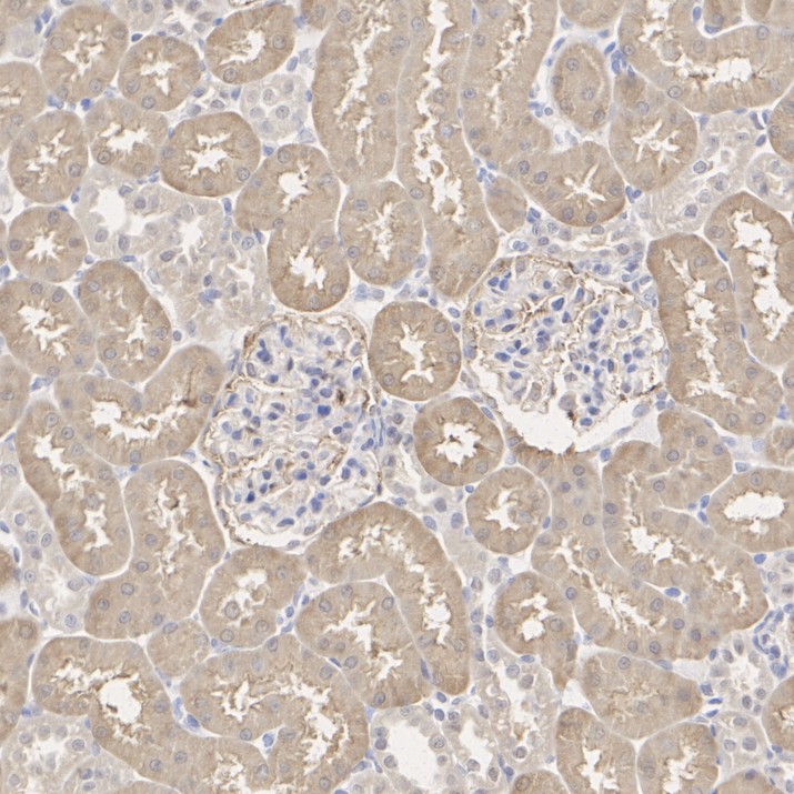 Immunohistochemical analysis of paraffin-embedded mouse kidney tissue with Rabbit anti-ATP citrate lyase antibody (HA750171) at 1/1,000 dilution.