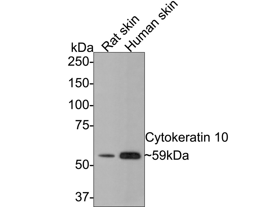 Western blot analysis of Cytokeratin 10 on different lysates with Rabbit anti-Cytokeratin 10 antibody (HA750193) at 1/1,000 dilution.