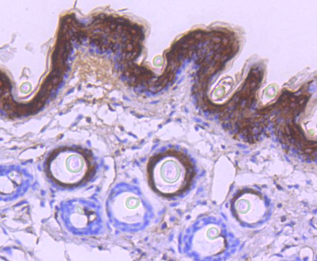 Immunohistochemical analysis of paraffin-embedded mouse skin tissue using anti-Cytokeratin 10 antibody. The section was pre-treated using heat mediated antigen retrieval with Tris-EDTA buffer (pH 8.0-8.4) for 20 minutes.The tissues were blocked in 5% BSA for 30 minutes at room temperature, washed with ddH2O and PBS, and then probed with the primary antibody (HA750193, 1/50) for 30 minutes at room temperature. The detection was performed using an HRP conjugated compact polymer system. DAB was used as the chromogen. Tissues were counterstained with hematoxylin and mounted with DPX.