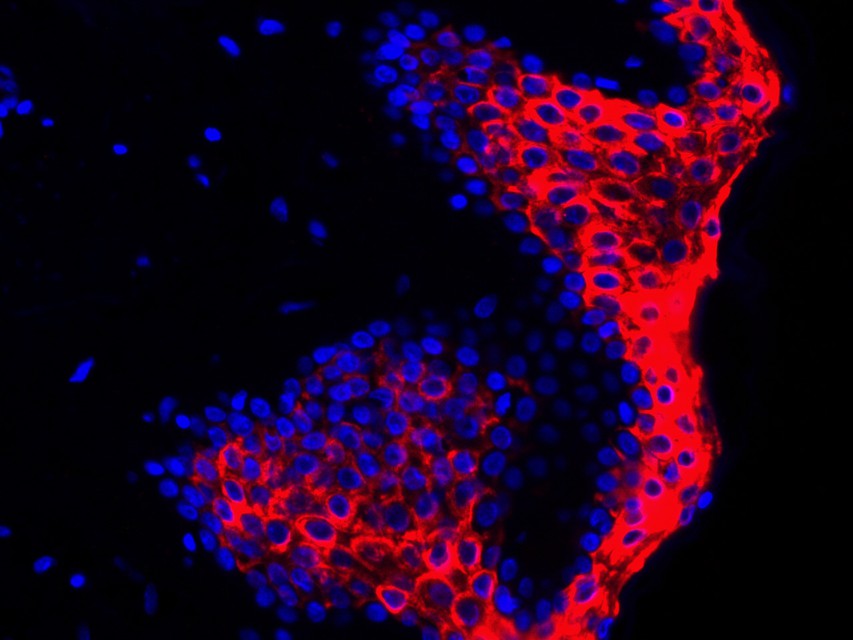 The section was pre-treated using heat mediated antigen retrieval with Tris-EDTA buffer (pH 9.0) for 20 minutes. The tissues were blocked in 10% negative goat serum for 1 hour at room temperature, washed with PBS. And then probed with the primary antibodies Cytokeratin 10 (ET1609-75, red) at 1/500 dilution at +4℃ overnight, washed with PBS.