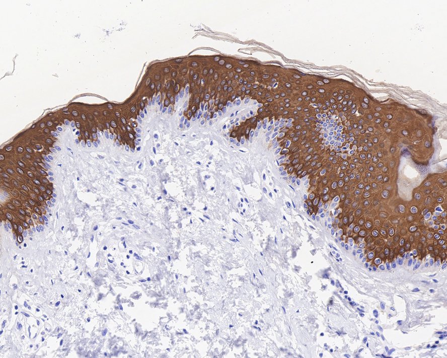 Immunohistochemical analysis of paraffin-embedded human skin tissue with Rabbit anti-Cytokeratin 10 antibody (HA750193) at 1/1,500 dilution.