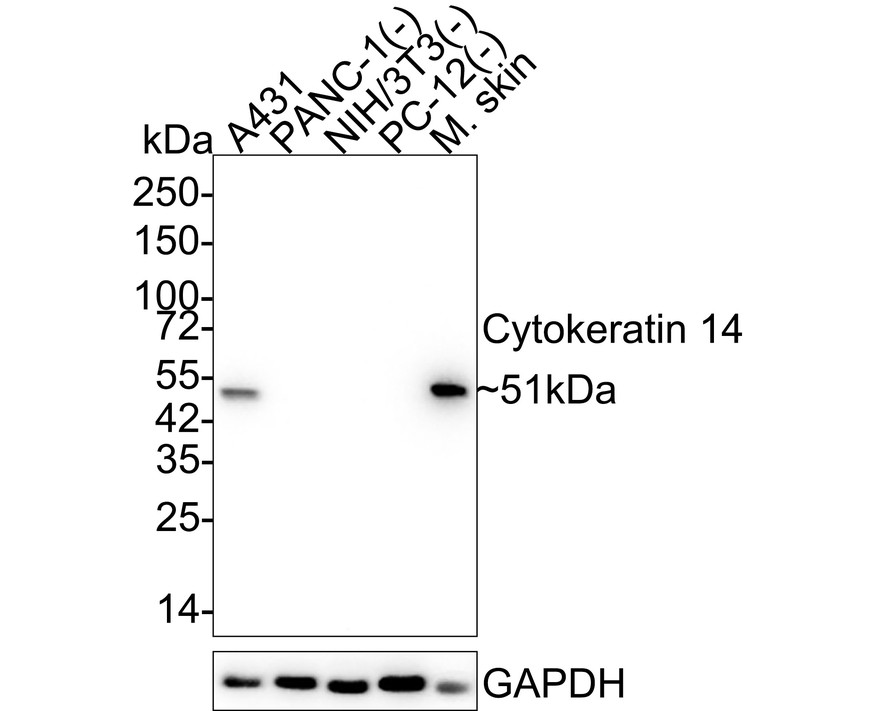 Western blot analysis of Cytokeratin 14 on different lysates with Rabbit anti-Cytokeratin 14 antibody (HA750216) at 1/2,000 dilution.
