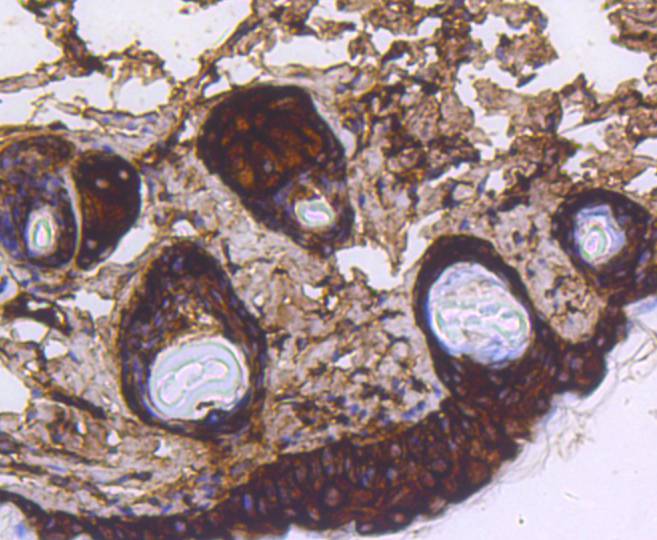 Immunohistochemical analysis of paraffin-embedded mouse skin tissue using anti-Cytokeratin 14 antibody. The section was pre-treated using heat mediated antigen retrieval with Tris-EDTA buffer (pH 8.0-8.4) for 20 minutes.The tissues were blocked in 5% BSA for 30 minutes at room temperature, washed with ddH2O and PBS, and then probed with the primary antibody (HA750216, 1/50) for 30 minutes at room temperature. The detection was performed using an HRP conjugated compact polymer system. DAB was used as the chromogen. Tissues were counterstained with hematoxylin and mounted with DPX.