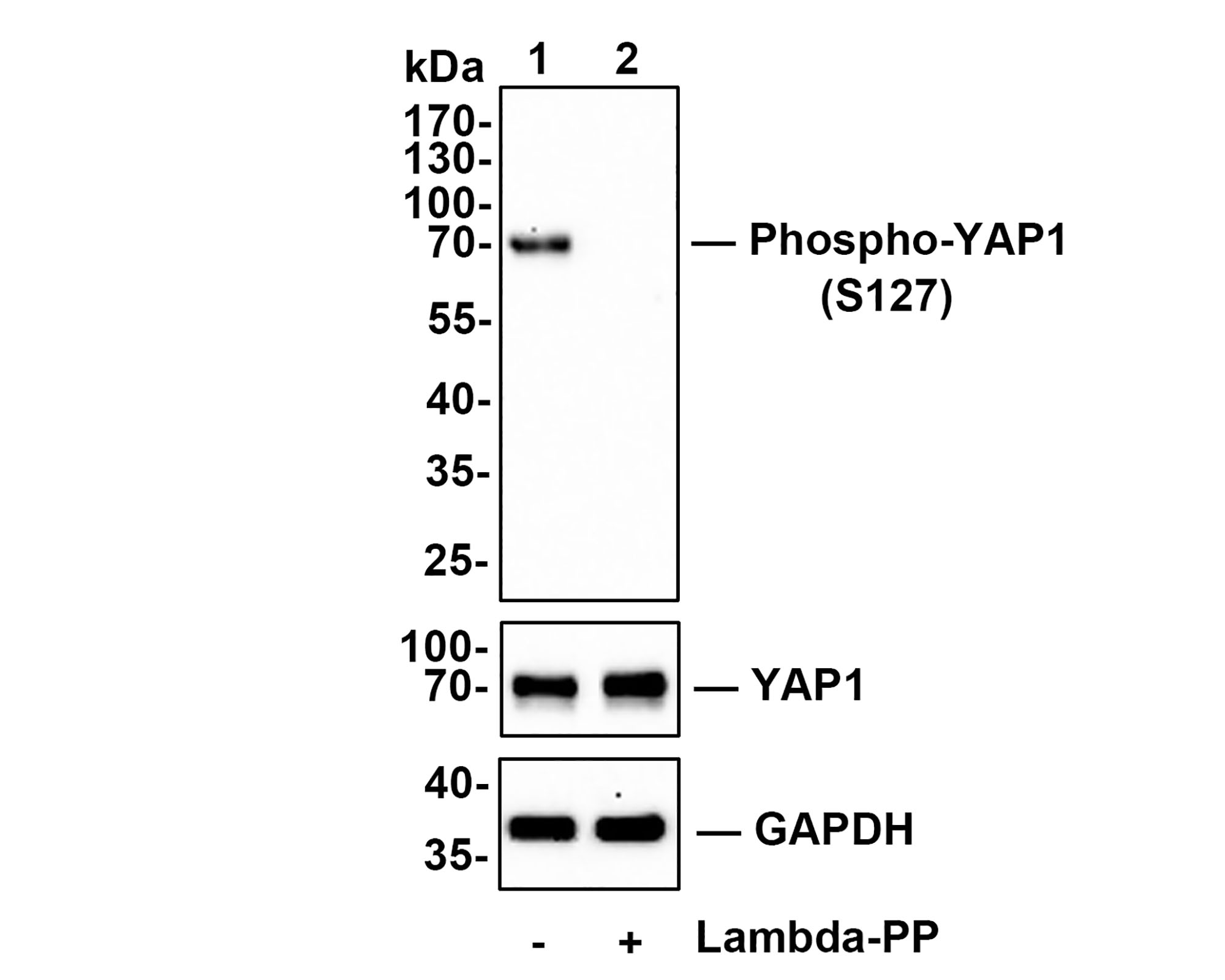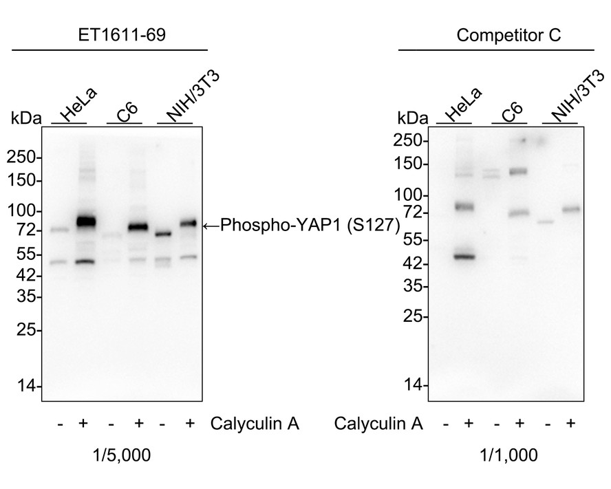 Western blot analysis of Phospho-YAP1 (S127) on different lysates with Rabbit anti-Phospho-YAP1 (S127) antibody (HA750269) at 1/5,000 dilution and competitor's antibody at 1/1,000 dilution.