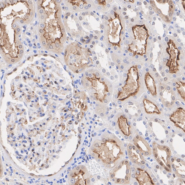 The section was pre-treated using heat mediated antigen retrieval with Tris-EDTA buffer (pH 9.0) for 20 minutes. The tissues were blocked in 1% BSA for 20 minutes at room temperature, washed with ddH2O and PBS, and then probed with the primary antibody (HA750269) at 1/5,000 dilution for 1 hour at room temperature. The detection was performed using an HRP conjugated compact polymer system. DAB was used as the chromogen. Tissues were counterstained with hematoxylin and mounted with DPX.