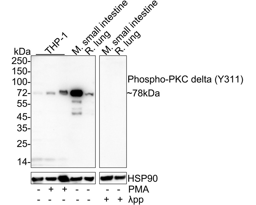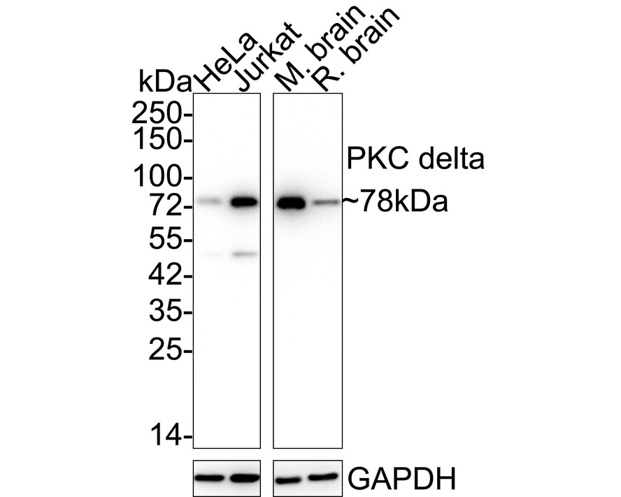 Western blot analysis of PKC delta on different lysates with Rabbit anti-PKC delta antibody (HA750325) at 1/5,000 dilution.