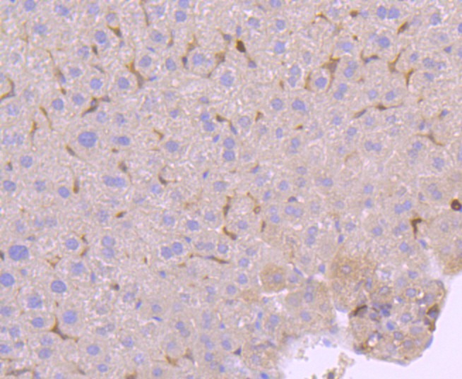 Immunohistochemical analysis of paraffin-embedded mouse liver tissue using anti-PKC delta antibody. The section was pre-treated using heat mediated antigen retrieval with Tris-EDTA buffer (pH 8.0-8.4) for 20 minutes.The tissues were blocked in 5% BSA for 30 minutes at room temperature, washed with ddH2O and PBS, and then probed with the primary antibody (HA750325, 1/50) for 30 minutes at room temperature. The detection was performed using an HRP conjugated compact polymer system. DAB was used as the chromogen. Tissues were counterstained with hematoxylin and mounted with DPX.