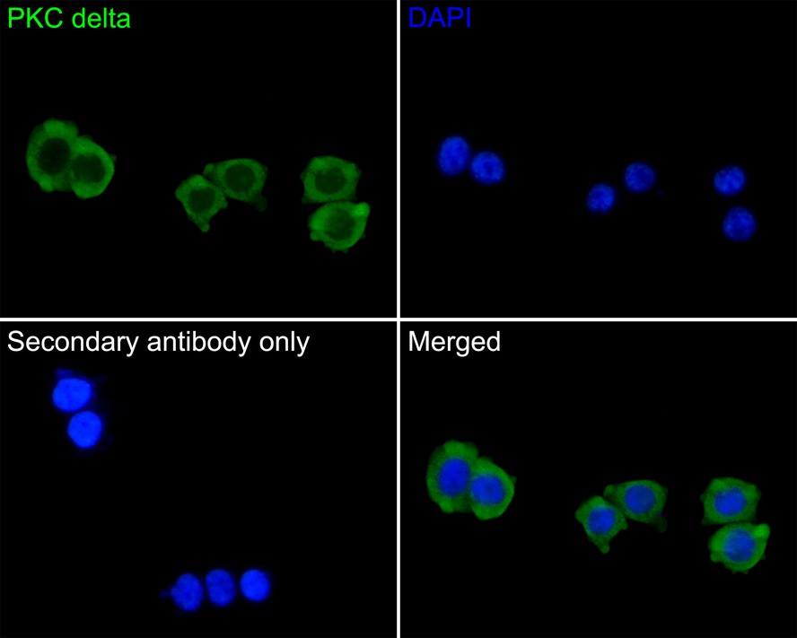 Cells were fixed in 4% paraformaldehyde for 10 minutes at 37 ℃, permeabilized with 0.05% Triton X-100 in PBS for 20 minutes, and then blocked with 2% negative goat serum for 30 minutes at room temperature. Cells were then incubated with Rabbit anti-PKC delta antibody (HA750325) at 1/50 dilution in 2% negative goat serum overnight at 4 ℃. Goat Anti-Rabbit IgG H&L (iFluor™ 488, HA1121) was used as the secondary antibody at 1/1,000 dilution. PBS instead of the primary antibody was used as the secondary antibody only control. Nuclear DNA was labelled in blue with DAPI.