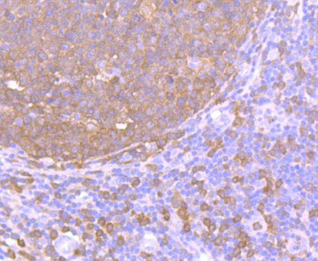 Immunohistochemical analysis of paraffin-embedded human tonsil tissue using anti-PKC delta antibody. The section was pre-treated using heat mediated antigen retrieval with Tris-EDTA buffer (pH 8.0-8.4) for 20 minutes.The tissues were blocked in 5% BSA for 30 minutes at room temperature, washed with ddH2O and PBS, and then probed with the primary antibody (HA750325, 1/50) for 30 minutes at room temperature. The detection was performed using an HRP conjugated compact polymer system. DAB was used as the chromogen. Tissues were counterstained with hematoxylin and mounted with DPX.